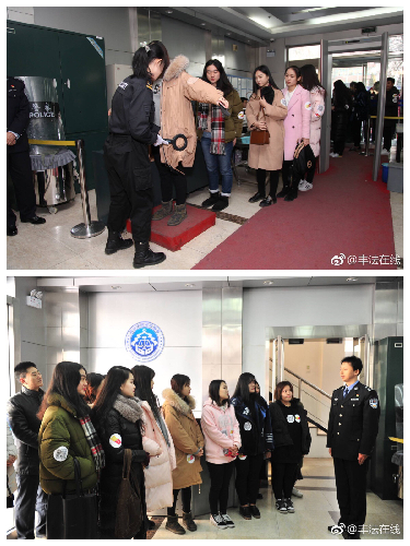 进入法院前要进行安检,丰台法院法警大队李永平同志向在场学生介绍了法院安检工作的标准、流程和重要性。“为了杜绝危险物品进入法院,确保诉讼群众和法院工作人员的人身安全,维护正常的审判执行秩序,安检班的同志们平均每天要安检1000人次。”