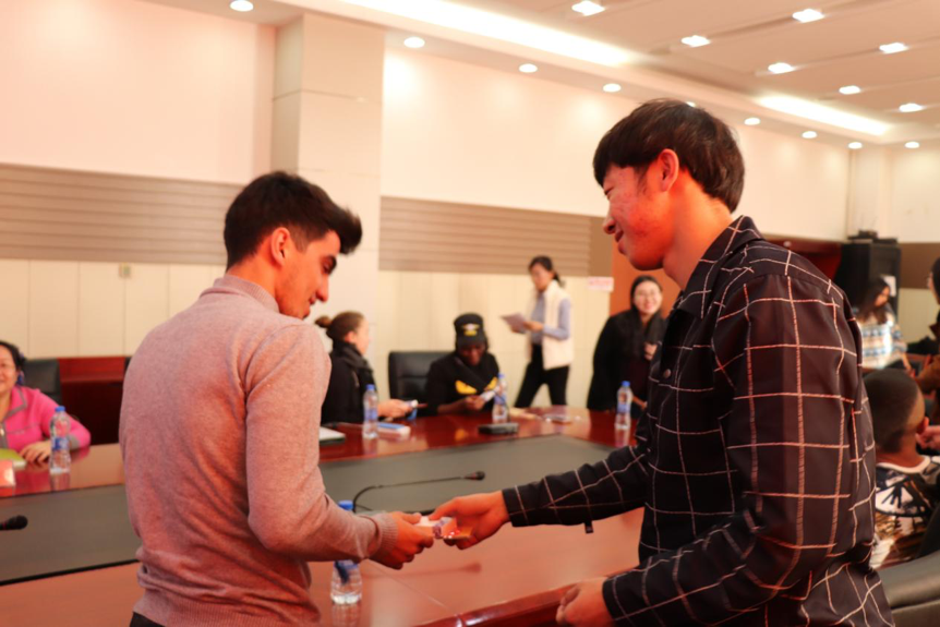接着,留学生们用流利的中文作了自我介绍,并表达了对五楼自拍 乃至中国的喜爱之情。其后, 2016级汉语国际教育班的学生向留学生们赠送了极具中国特色的小礼物。