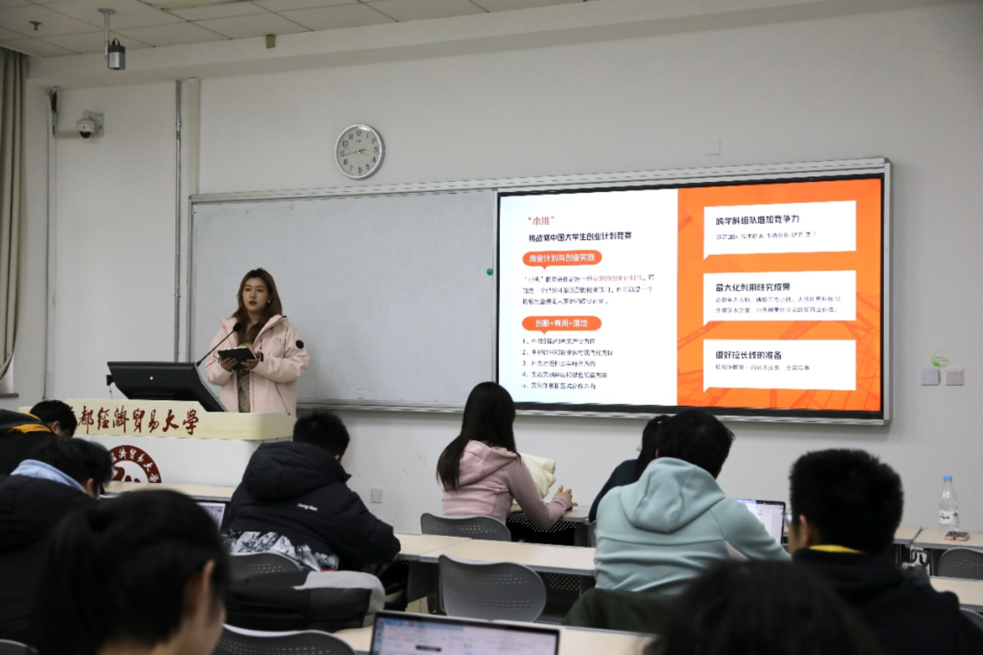 在经验分享环节,多位往届优秀学姐依次登台,倾囊相授备赛心得。吕知霏、任思涵、张颖茜聚焦备赛实操,结合自身经历,生动讲述了项目筹备过程中曾走过的弯路与需要规避的雷点,为在场同学提供了极具参考性的避坑指南。