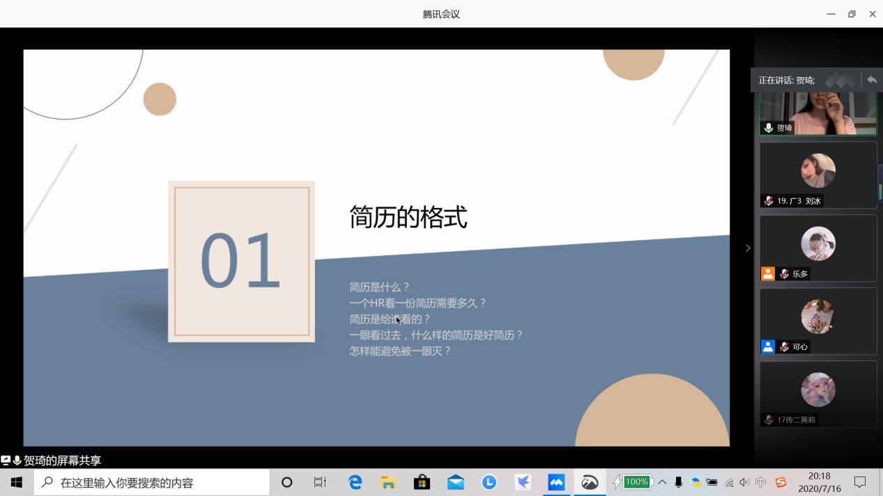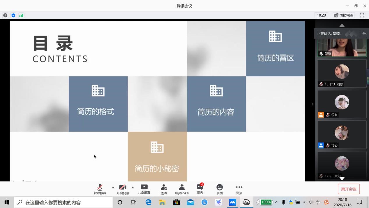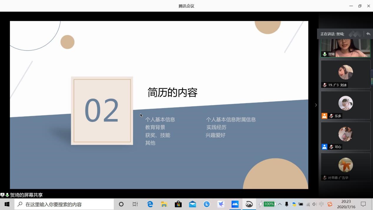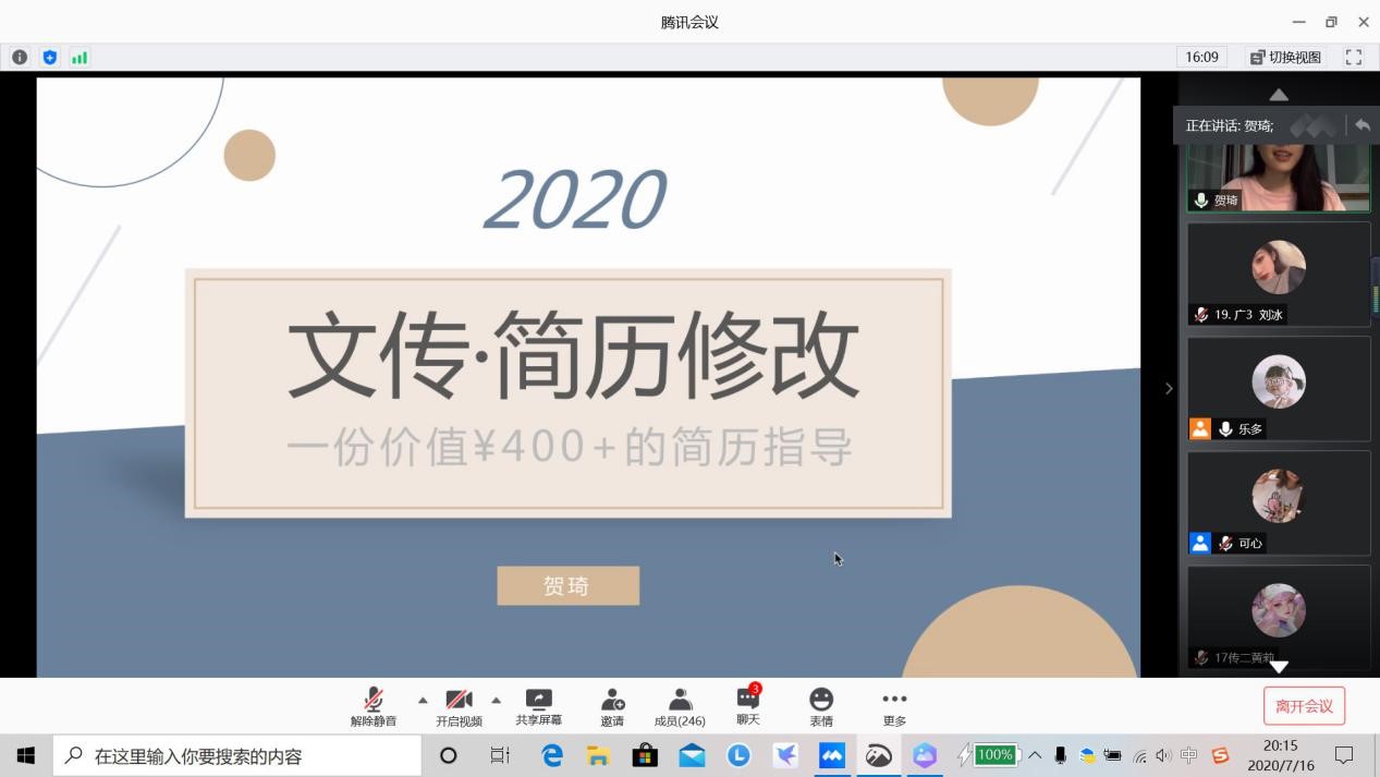 盛夏已至,酷暑的炎热也阻挡不了同学们实习、求职的脚步,若写得一份漂亮的简历,就如同为自己无形之中画了一个得体的“妆容”,让自己在人群中脱颖而出。为了帮助同学们提升制作和修改简历的能力,让更多的同学们赢在起跑线上,五楼自拍 分团委社会实践部于2020年7月16日开展了简历指导分享会,特邀贺琦学姐对在校同学的简历制作及修改进行指导,在线为同学们解决各种“疑难杂症”。“职”等你来简历指导分享会是五楼自拍 “扬帆未来,筑梦远航”生涯规划系列活动之一。