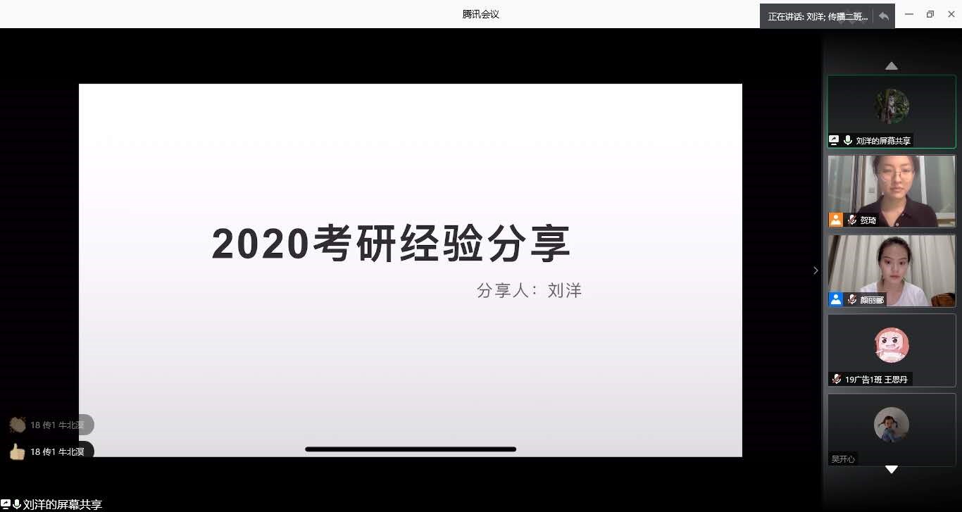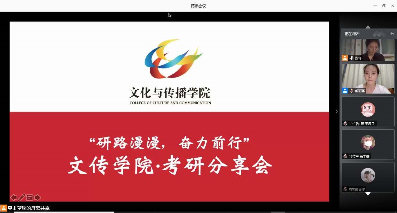 以梦为马,不负韶华,伴随着2020考研结果尘埃落定,2021考研大军已踏上了追逐梦想的征程。为了帮助同学们更好地备战2021考研,文传学院分团委社会实践部于2020年7月9日举办了一场线上“研路漫漫,奋力前行——考研分享会”。该分享会是五楼自拍 “扬帆未来,筑梦远航”生涯规划系列活动之一。