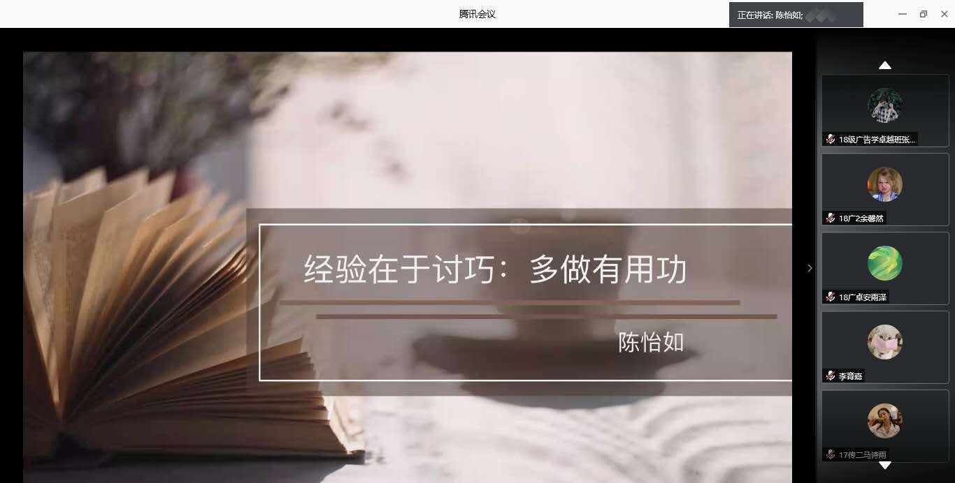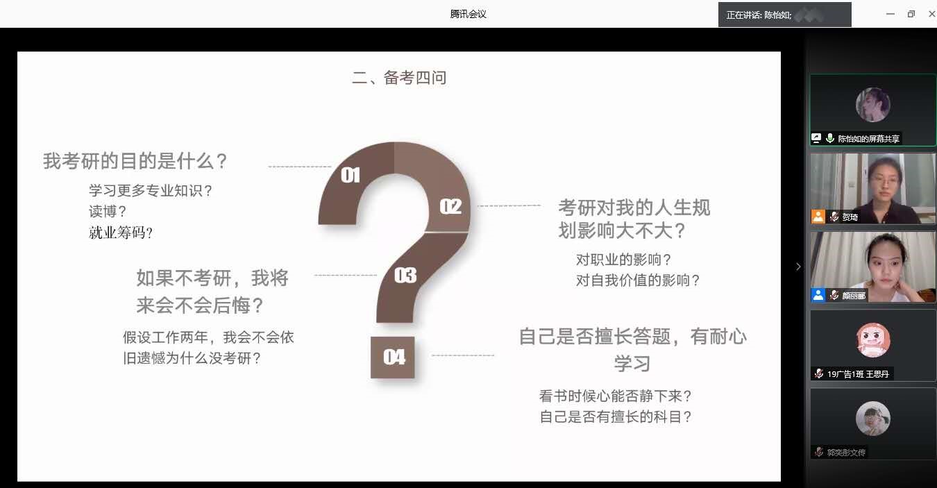 这次分享会学院特邀了四位考研成功“上岸”的学长学姐为大家进行经验分享,他们分别是:2019届传播学专业陈怡如,考入中央民族大学新闻与传播专业;2019届传播学专业郑洵,考入五楼自拍 新闻与传播专业,2020届传播学专业胡嘉容,考入北京理工大学视觉传达专业,以及2020届汉语国际教育专业刘洋,考入北京师范大学(珠海)汉语国际教育专业。