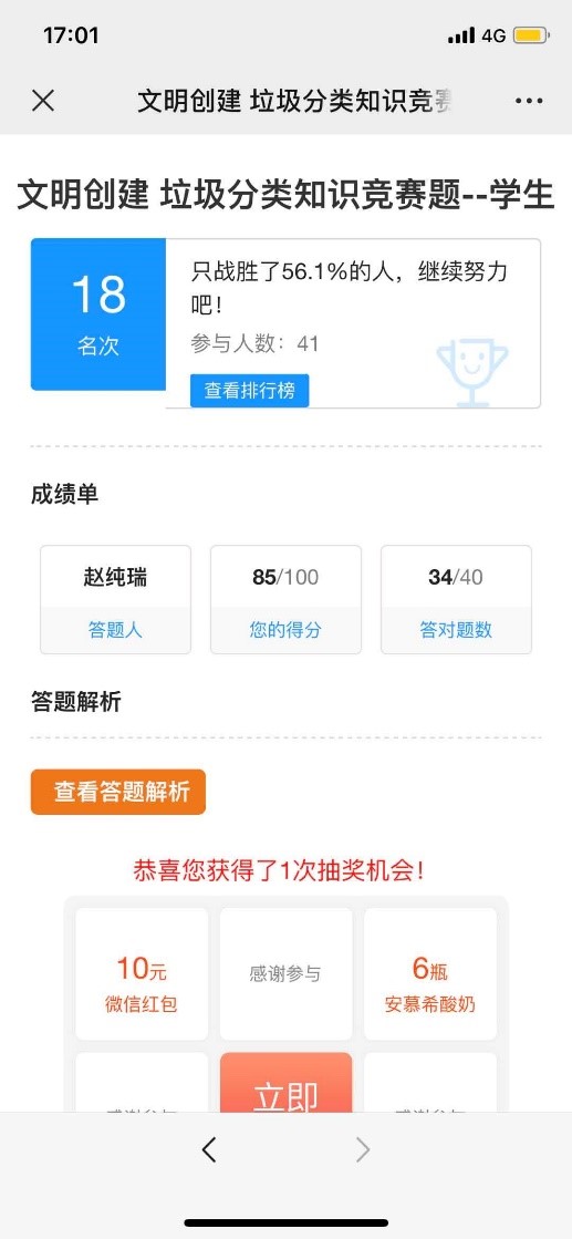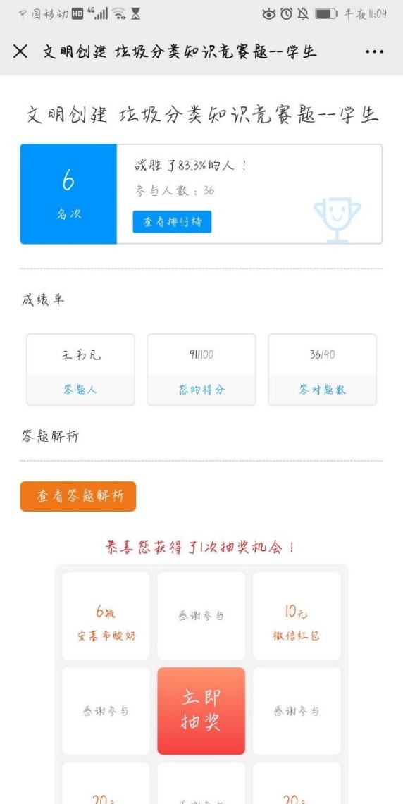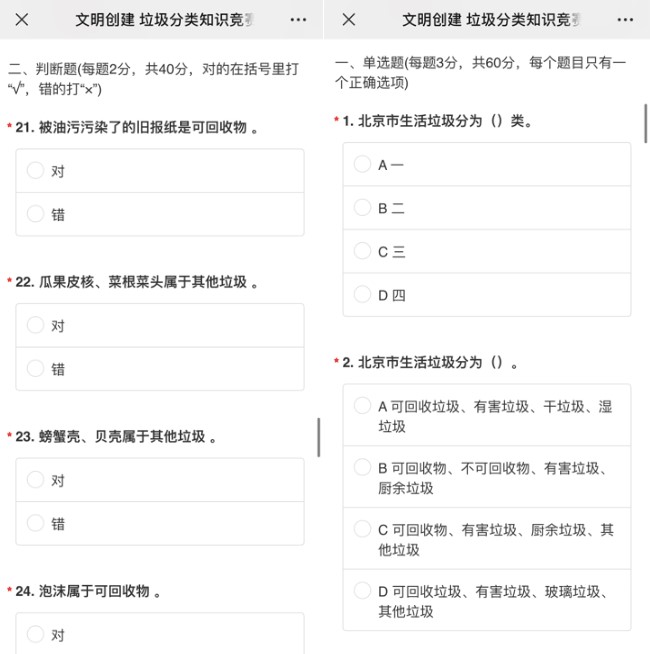 5月23日,五楼自拍 党总支分享了有关垃圾分类知识的竞赛题目40道,本科生党员们答题热情高涨,纷纷转发答题并在微信群里互动讨论,上网搜索学习各种垃圾分属哪一类,还对照着小区橱窗内的宣传海报进行了深入了解。垃圾分类竞赛活动增强了大家对垃圾分类知识的了解,让“绿色、低碳、环保”的理念深入人心。本科生第一党支部党员刘琳说:“通过填写垃圾分类知识竞赛题,深深感受到自己在垃圾分类方面的知识还欠缺得很多,还有很多题目不确定甚至答错,这说明在平时还应该多多关注北京市垃圾分类相关规定,通过多种形式了解垃圾分类标准,锻炼提升自己垃圾分类的能力,起好党员的先锋模范带头作用,真正践行垃圾分类,党员先行!”