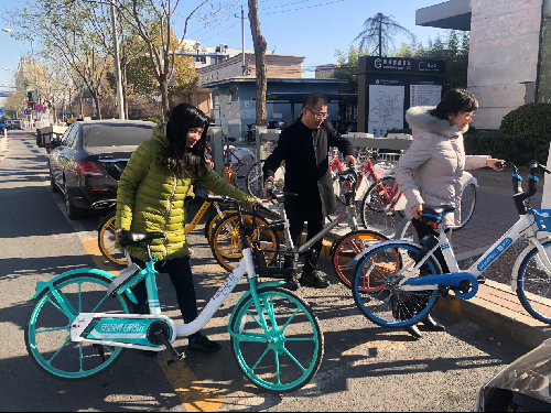 活动中,党员们热情高昂、干劲十足,将学校北门至首经贸地铁站间停放在人行便道上的共享单车排放整齐。