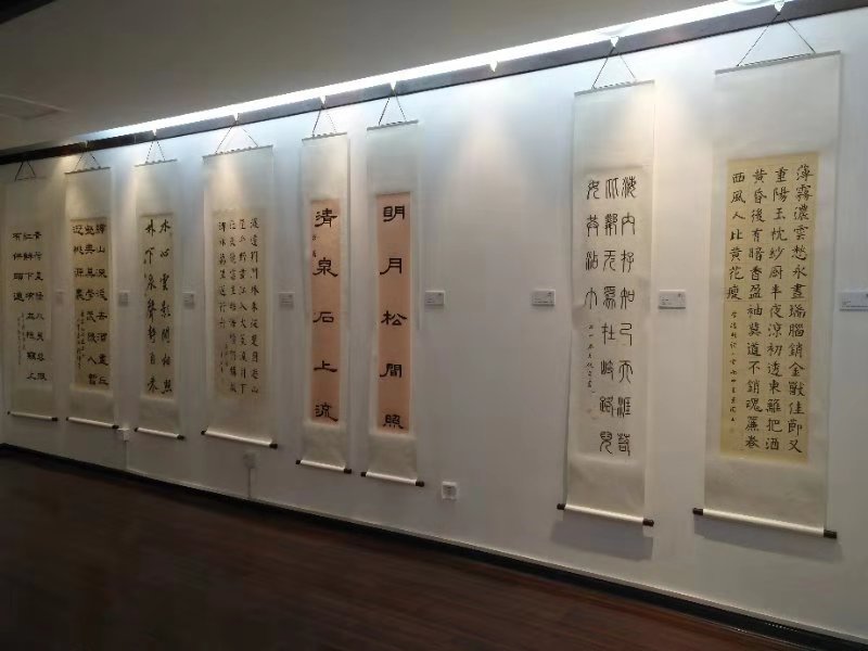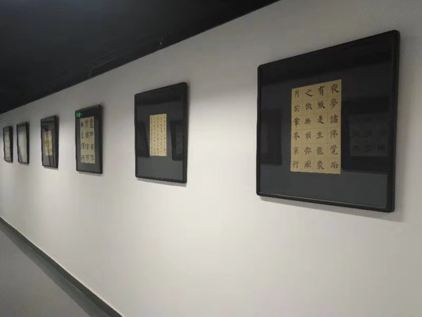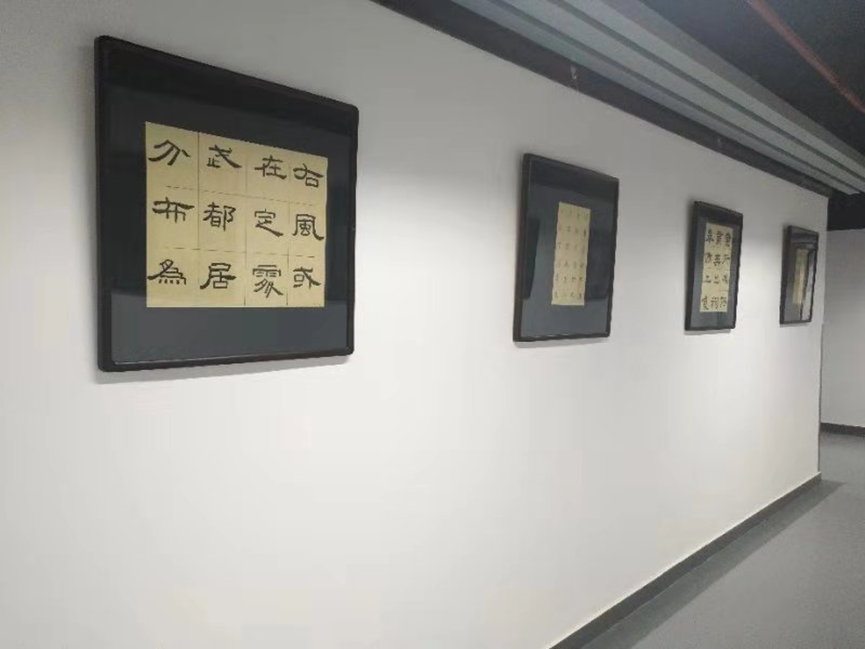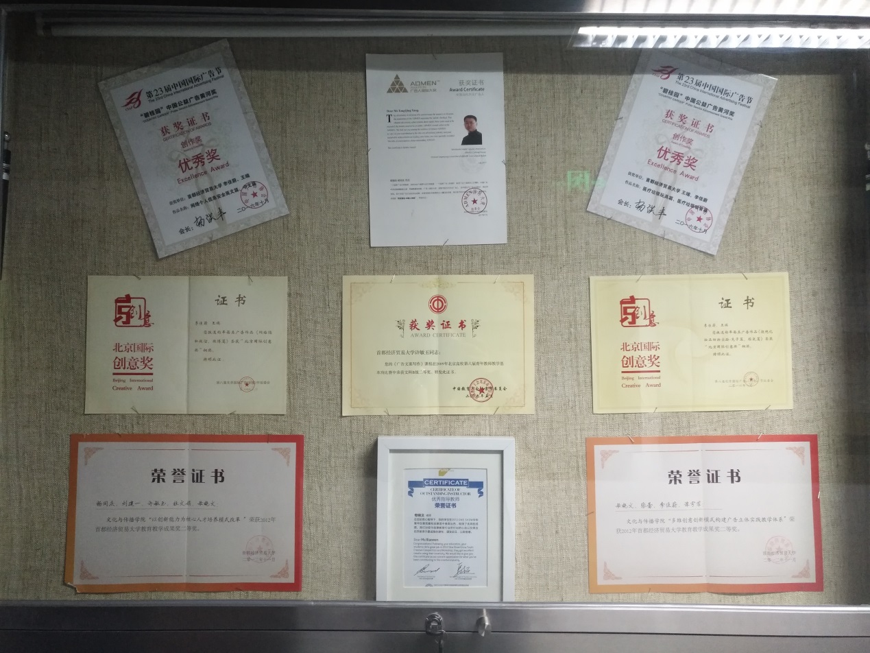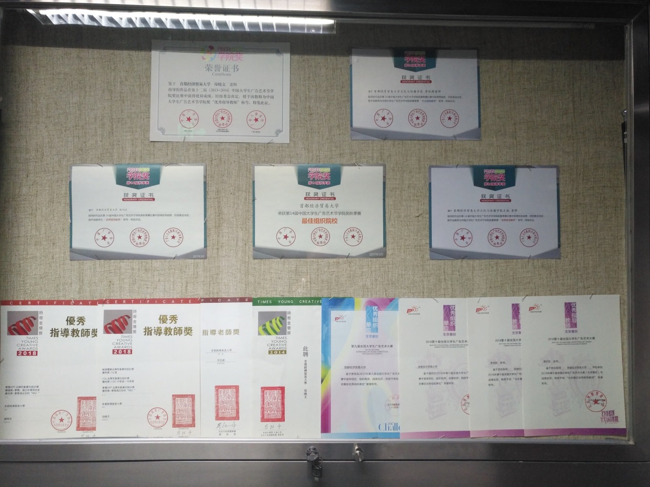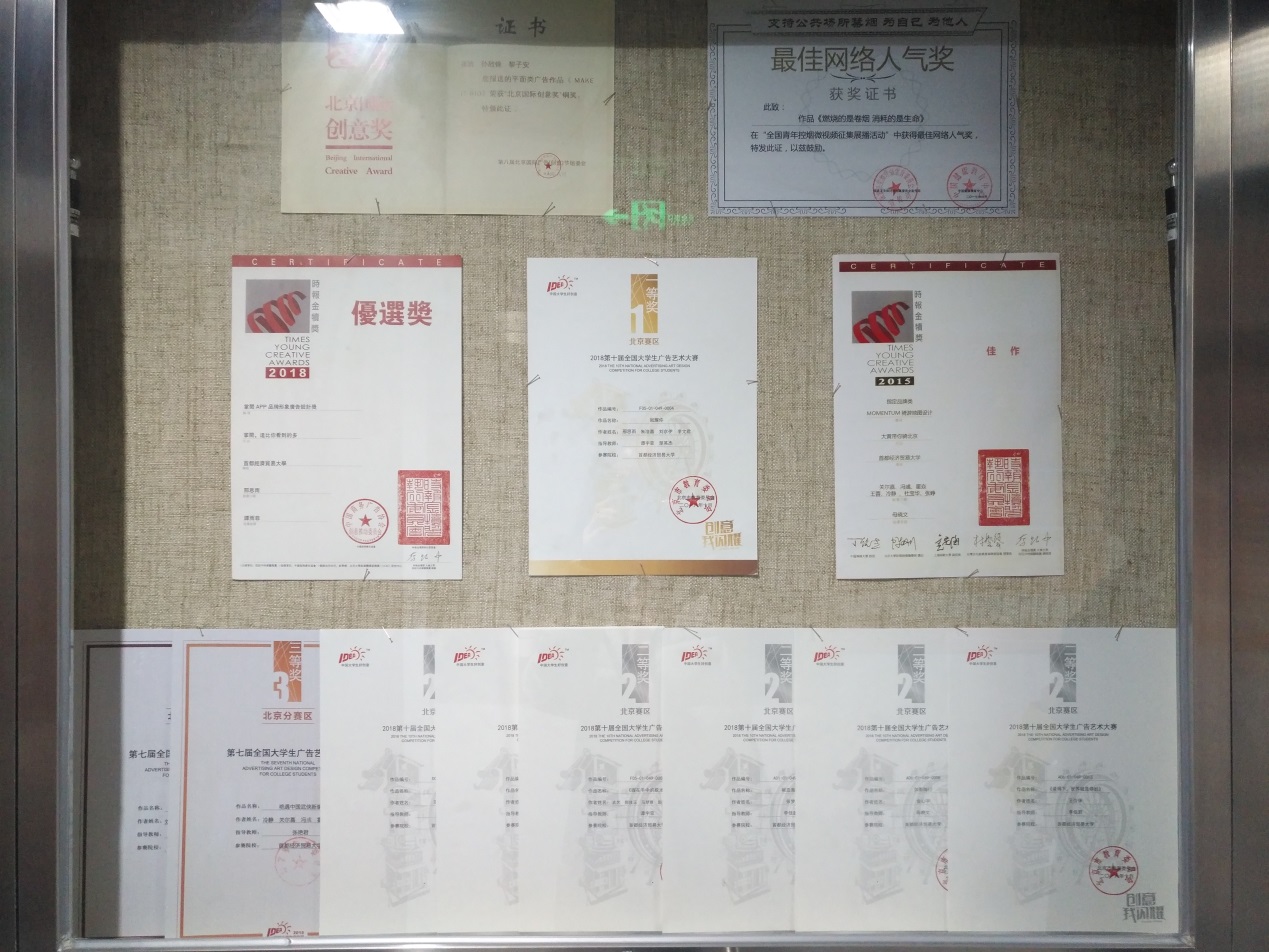 在传媒实验中心的走廊及展室中,展示出了老师们及同学们的书法、绘画、摄影、出版书籍等作品,作品旁边的小标签细心的解释了内容及作者,一本本书籍的出版、一张张证书的亮相、一个个奖杯的获得,都体现出五楼自拍 人才辈出,师生思维的活跃以及积极向上的精神风貌。