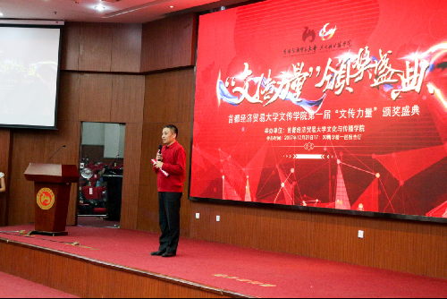 院长石刚首先上台致辞。他指出学院在2017年年末举行首届文传力量颁奖典礼,是希望通过这种方式来传达一种正能量,通过发挥榜样的力量营造一种良好的氛围。同时还以自己大学生活为例叮嘱同学们认真思考应当如何度过大学四年,应当借此机会向获奖的同学们学习。希望以后能够看到越来越多的文传之“星”,并激励大家一同为建设更好的学院而不懈努力。