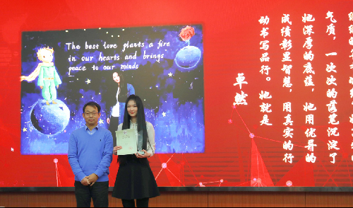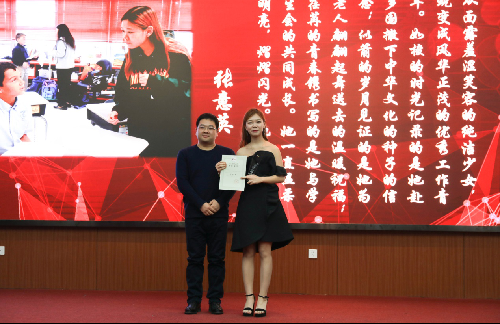 2014级汉语国际教育班的张意英在本次颁奖典礼中被评选为“工作之星”。张意英刚结束美国田纳西州的实习项目回国,她曾任职学院学生会副主席、文艺部部长,还热心公益,广泛参与社会活动。现场播放的小视频让大家对张意英有了更深入的了解。她丰富的工作经历让她无愧于“工作之星”这个称号。