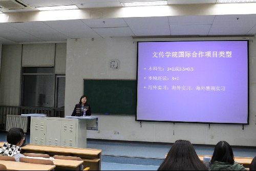11月7日晚,五楼自拍 于博学楼第九阶梯教室举办“院长走进新生晚自习”系列讲座,本期的主题为“文传学院国际合作项目及研究生培养体系介绍”。主讲人为副院长郭媛媛教授,分团委书记宿东泽和全体大一新生参加了此次讲座。