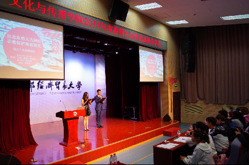 首先进行展示的是“指尖上的非遗探访”团队。该团队以北京绢人为例,进行非物质文化遗产保护现状的实地调研。丰富的实践成果和单佳琪同学大方的舞台表现为团队赢得了二等奖。