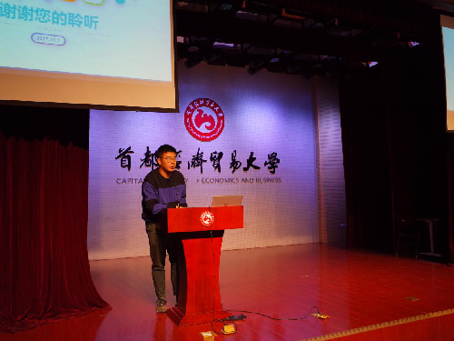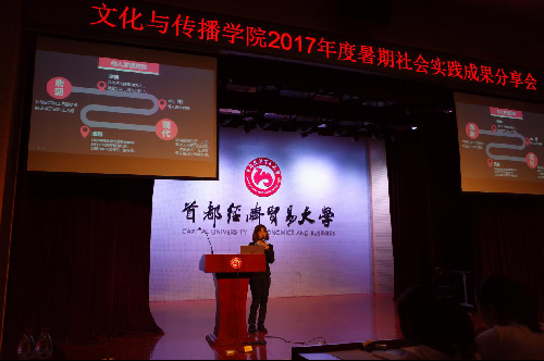 接下来是由欧阳熙同学展示的“‘旅游扶贫’机制完善调研”团队。该团队采用分散调研法,队员分别前往北京、吉林、湖南、湖北、河北等地进行了大量的实地调研工作。汇报过程中,欧阳熙着重谈到了整体实践活动带给他们的反思和收获,真诚的分享自己的经验和教训,给在场观众带来了启发。该团队最终获得了三等奖。