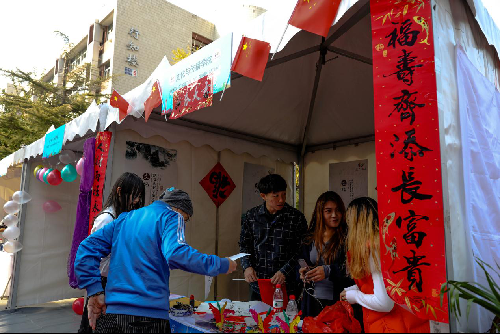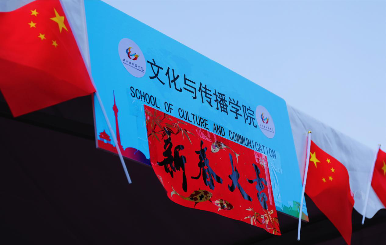 经过精心的布置,文传学院的展台文化氛围十分浓郁,对联、福字、毛笔、毽子等物件,为展台增添了浓重的中国韵味;院旗、院徽等学院元素的加入,也将文传人的自信和风采得以展现。