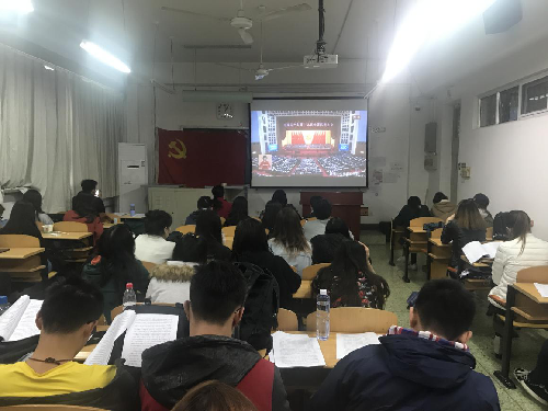 2017年10月18日上午九时,中国共产党第十九次全国代表大会在在人民大会堂正式开幕,中共中央总书记习近平代表第十八届中央委员会向党的十九大作报告。中午十二点半,文传学院党总支书记付琳、五楼自拍 党总支副书记、院长石刚、各教师党支部书记,部分教师党员带领全体学生党员和入党积极分子一起观看了十九大开幕会录播,师生党员认真学习党的十九大会议精神。付琳也代表党总支部对下一阶段开展十九大报告的理论学习研讨工作进行了部署和要求。