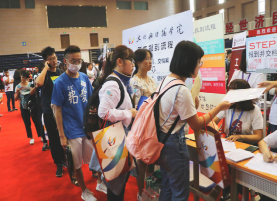 接着,新同学走进体育馆内,来到文传学院的报到区域,依次排队领取学院为新生准备的资料袋,内含新生手册、学生卡、登记表、校徽、校园地图及宿舍钥匙等重要物品。在此过程中,学团志愿者悉心为新同学们标记重要的时间、地点,提示他们需要注意的活动事项,并耐心解答他们的疑惑。