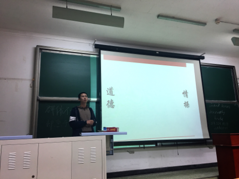每个组都根据自己所读的书目的特点进行了精心的准备和编排。《中国人》书目组介绍了书的主要内容他们对书的思考;《战争与和平》书目组对这部宏大的巨著的背景以及作品内容进行了解读,留下了“什么是战争,什么是和平”的问题;有三个小组选择了《乌合之众》做分享,第一组设计了一个情景剧,先为大家播放了一段影片,然后提出“群体不善于思考却急于行动”的问题,小组成员以回答问题的方式提出了自己对书的理解和观点;分享《乌合之众》的第二组,提出了“如何在群体中保持理性与通脑清醒”的方法;分享《乌合之众》的第三组采用更加新颖的辩论形式,把书中提炼出来的观点作为他们的辩题。分享《曾国藩传》的同学们采用历史穿越剧的表演形式介绍了人物简介和故事梗概,多角度地对曾国藩进行评价;分享《道德情操论》的小组通过对老子《道德经》的研读,分享了对“道德”、“情操”的学习心得;伴着悠扬的琴声;研读《论语》小组带着大家一起“穿越”回到了千年前,以情景剧的形式,展示了学子们对这部经典古籍的思考与讨论。