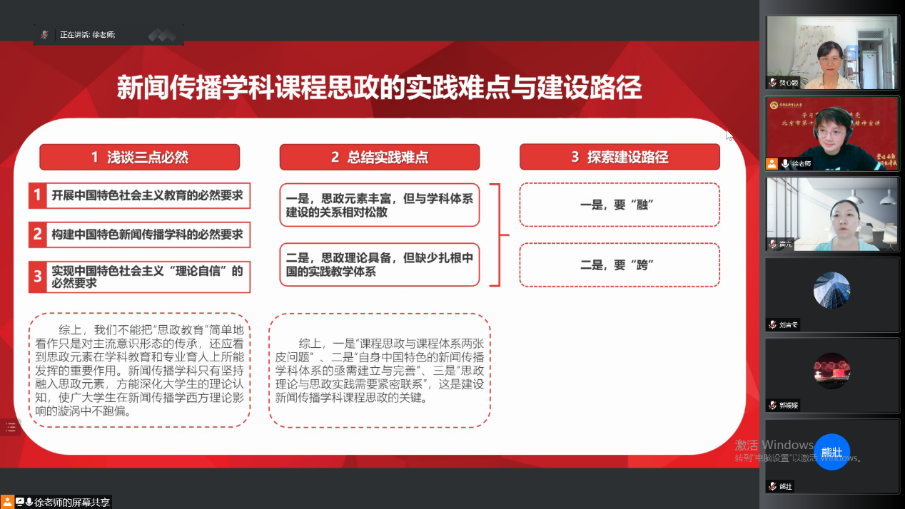 徐轶瑛以“新闻传播学科课程思政的实践难点与建设路径”为主题,紧密贴合新闻传播学科的学科特点和专业课的课程思政如何扎根到实践环节、落实到对于现实问题的关照等问题,从“浅谈三点必然”、“总结实践难点”、“探索建设路径”三个层面探讨了如何“融”(即打破思政元素与新闻传播学科体系间的松散关系,由课程思政向专业思政、学科思政提升,打造真正具有中国特色的新闻传播学科体系)和如何“跨”(即跨课程、跨专业、跨实践)的问题。