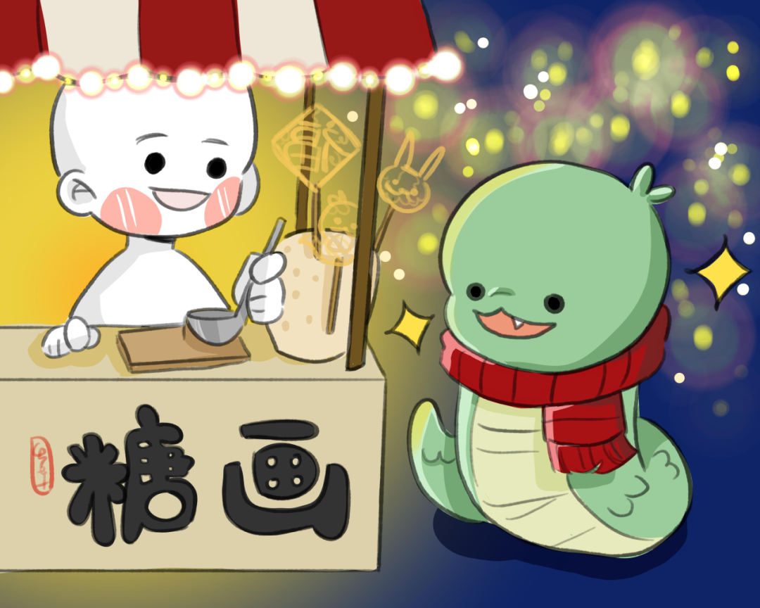 在灯会的一角,小青蛇被一阵阵热闹的锣鼓声吸引。原来,这里正在进行一场精彩的非遗表演。一位老艺人正专注地制作着糖画。他用一把小勺舀起溶化的糖汁,在石板上飞快地来回浇铸,画出各种栩栩如生的图案,有威武的龙、灵动的凤,还有憨态可掬的小动物。这门技艺传承了数百年,是中华民族智慧的结晶。小青蛇看得目不转睛,它仿佛看到了老艺人手中不仅仅是糖画,更是一段段鲜活的历史,一个个动人的故事。