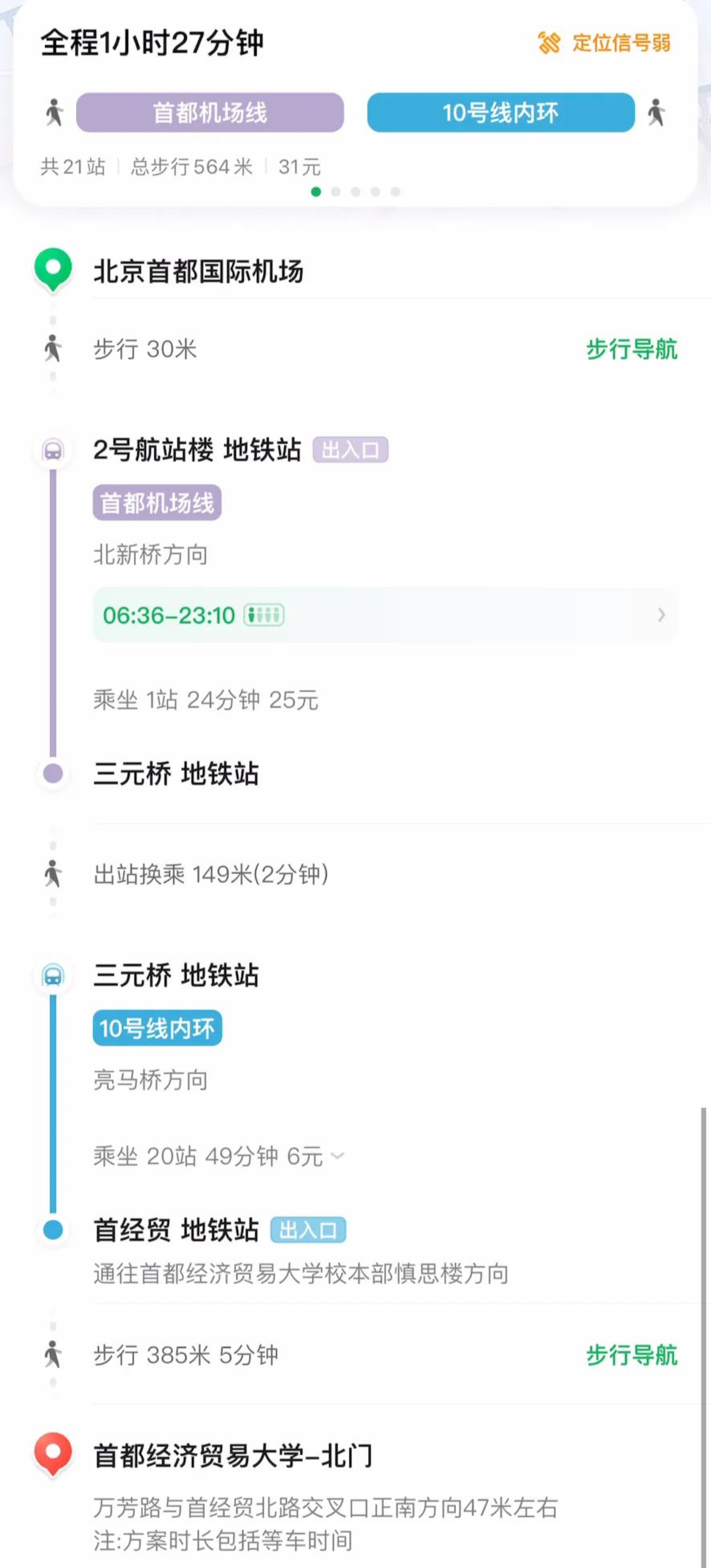 地铁:乘坐1号线—国贸站换成10号线(亮马双井方向)—首经贸站(D口出到达学校北门/C口出到达塞欧公寓)大约1小时5分钟到达