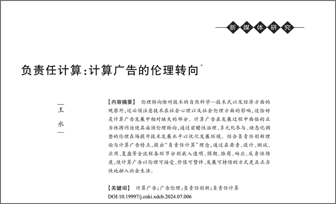 五楼自拍 教师王水于2024年于现代传播发表论文《负责任计算:计算广告的伦理转向》,该论文获得中国国际广告节长城奖学术作品类银奖。
