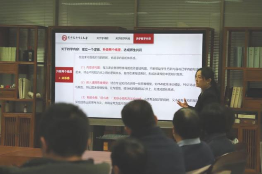 关于“教学内容”,王雅婷提到提高课堂教学质量,就要做到:建立一个逻辑、升级两个维度和达成师生共识。所谓“一个逻辑”,就是教师需要在传授课堂知识和提升学生能力之间建立一个联结逻辑:以专业知识为载体,训练学生高阶思维能力。创造性地将布鲁姆的思维能力层级与学生的学习过程相结合,让教育教学逻辑变得更加清晰。所谓“两个维度”,分别是高阶性和体系感。她认为,通过有章法的提问这一方法,可以实现锤炼更高阶思维能力这一目的;通过升级内容的体系感,可以让学生感到所学内容的清晰性。她还特别分享了自己独创的教学小技巧——“双小结”教学法。所谓“师生共识”,就是要让学生学会“接受提问、喜欢提问、享受提问”,最终实现以课程为载体,打造学生的高阶思维能力的目标。这些创新性的见解,引发了现场老师们深刻的思考。