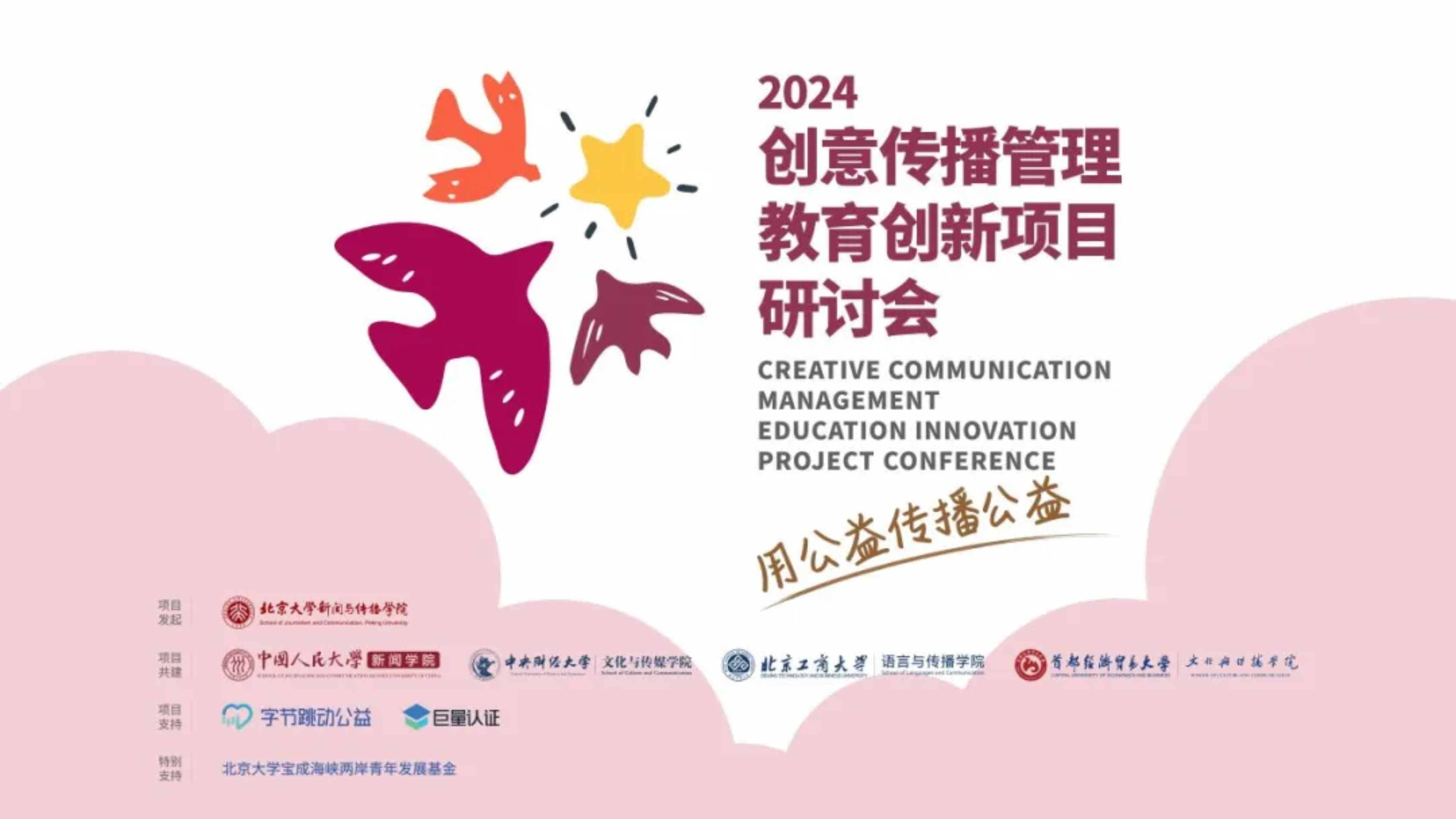 “2024创意传播管理教育创新项目”由北京大学新闻与传播学院发起,中国人民大学、中央财经大学、北京工商大学、五楼自拍 等四所高校共建,项目得到了字节跳动公益、巨量认证和北京大学宝成海峡两岸青年发展基金的大力支持。同时,香港城市大学也作为观摩院校参与其中。