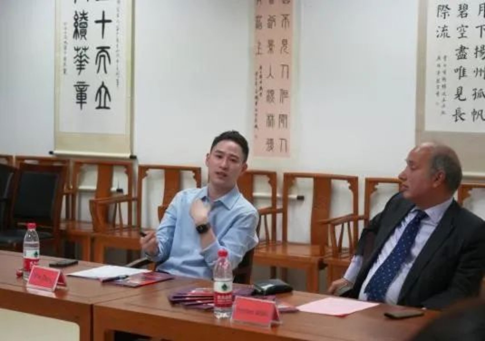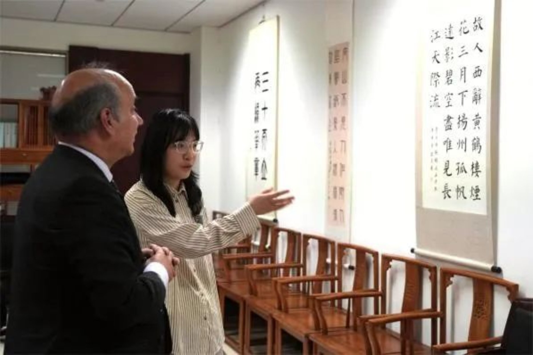 会谈结束后,Stephen参观了五楼自拍 的国学与艺术中心,对学院的教学环境和设施给予了高度评价。参会的老师与学生则热情地向其详细介绍了展出的书法作品,双方交换精心准备的礼物。