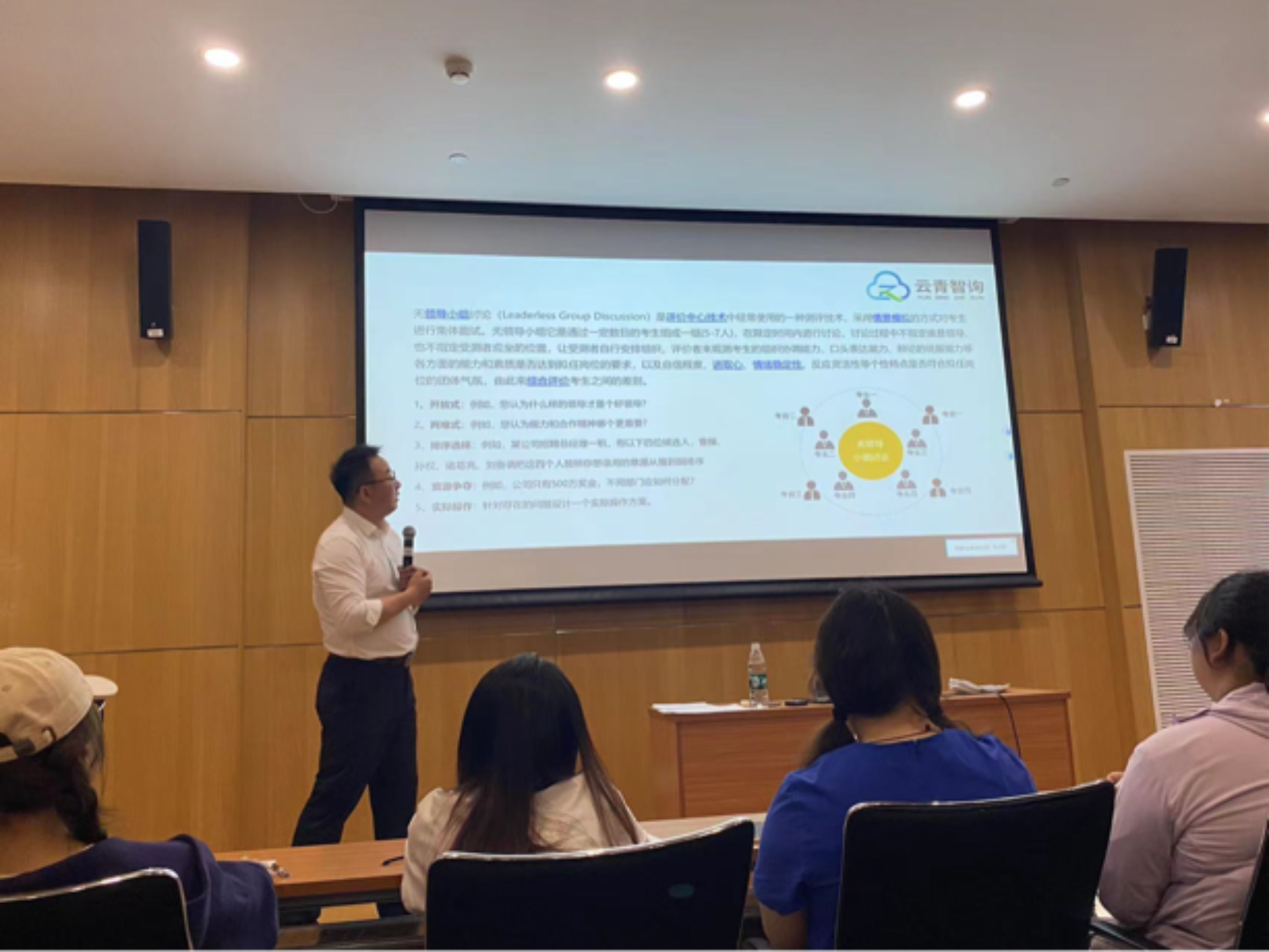 在“无领导小组讨论实训”中,白云通过带领同学们进行无领导讨论的练习,逐步让同学们了解、掌握无领导小组讨论所需具备的能力与品质。