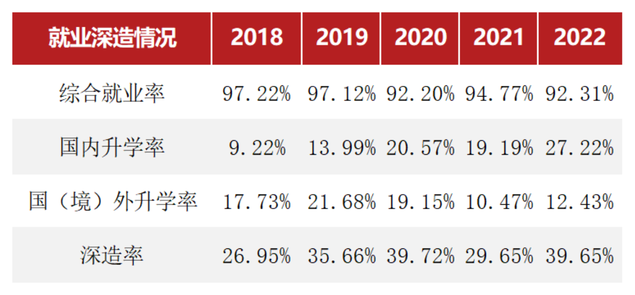 近三年学生平均综合就业率保持在94%左右,平均深造率保持在33%左右。